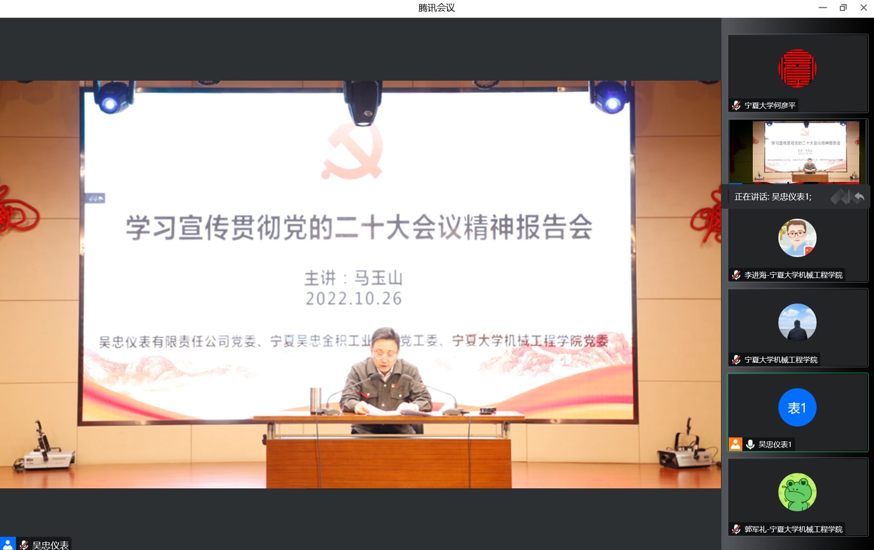 10月26日下午,新葡的京集团35222vip组织学院师生线上参加学习贯彻党的二十大精神宣讲报告会。党的二十大代表、中国工程院院士、宁夏吴忠仪表有限责任公司党委书记、新葡的京集团35222vip院长马玉山作专题辅导。