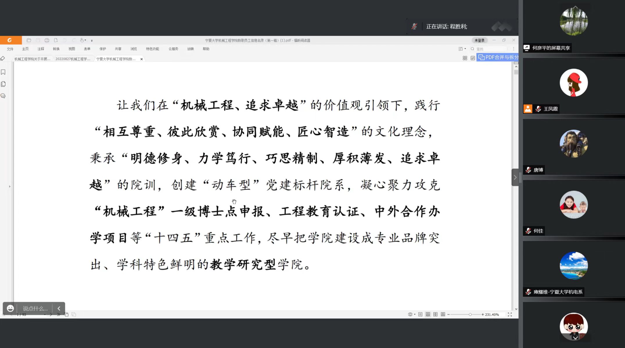 程胜利对学期基层党支部规范化标准化建设进行专题辅导。他希望基层党建工作要坚持“五个规范化”、“七个有力”标准,以支部规范化标准化建设为抓手,扎实开展特色鲜明的支部创建活动。各党支部书记要高水平履行职责、高质量发挥作用,确保党的建设始终走在各项工作最前面,始终引领、服务、保障学院中心工作。创建工作要对标对表,聚焦问题,将党支部规范化建设工作做精做细做实,以实际行动推进基层党建工作不断发展,高质量推动学院“机械工程”一级博士点申报、工程教育认证、中外合作办学等“十四五”重点工作,真正实现以党建的高质量开展引领教学研究型学院的高质量发展,以实际行动迎接党的二十大胜利召开。