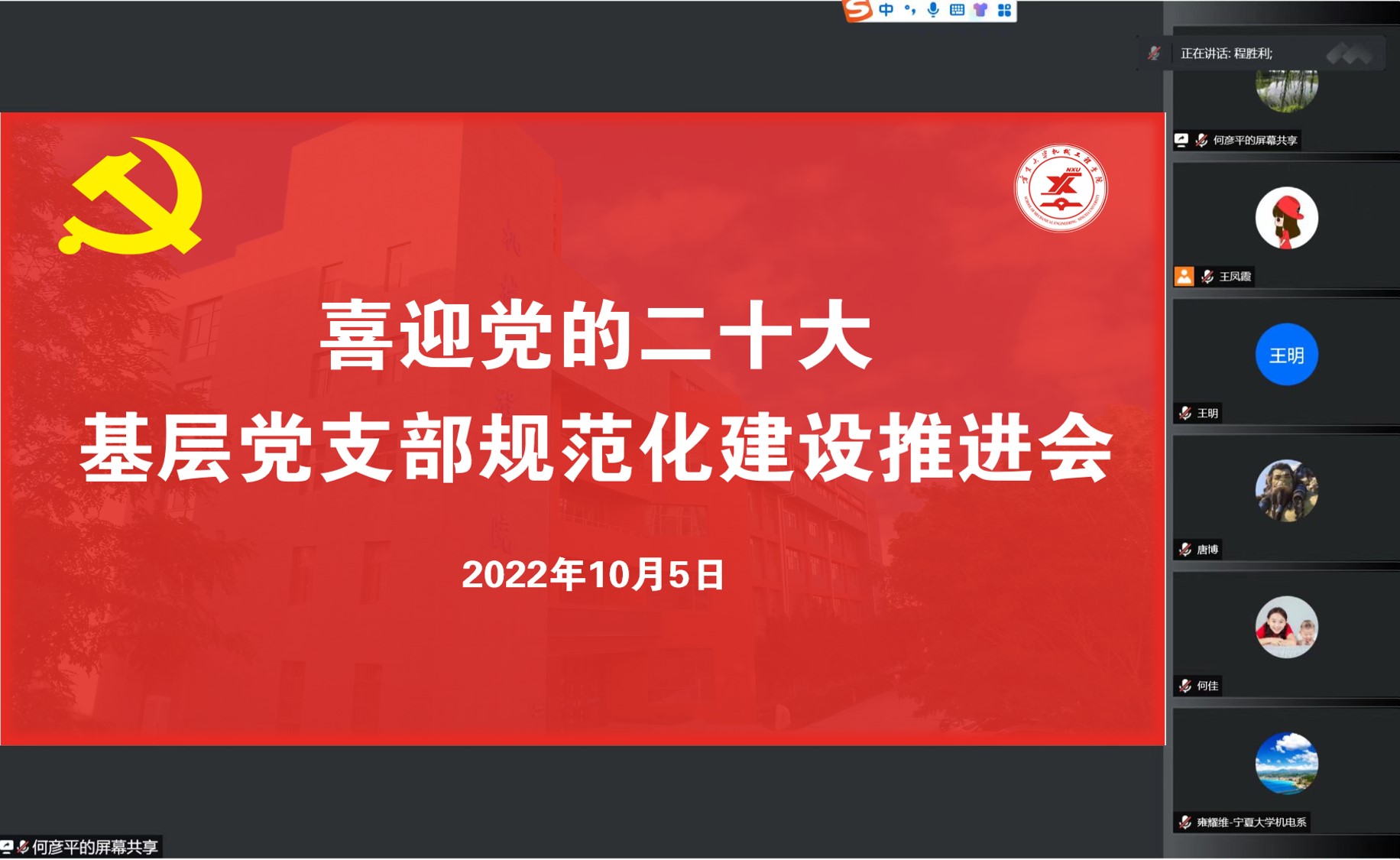 为深入贯彻落实《新葡的京集团35222vip基层党支部规范化标准化建设方案》和《关于开展新葡的京集团35222vip首批基层党组织“对标争先”建设计划的通知》文件要求,进一步推动党支部标准化规范化建设,持续推动基层党建提质增效,加强党员骨干队伍培养。10月5日,新葡的京集团35222vip召开“喜迎党的二十大,基层党支部标准化规范化建设”推进会。学院党委书记程胜利、副书记何彦平及学院各基层党支部委员参加会议。