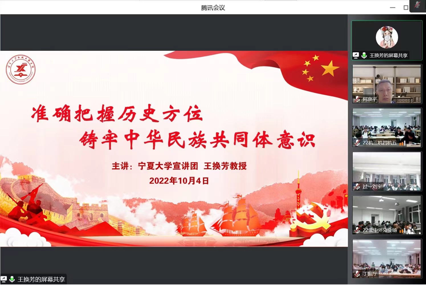 为深入学习贯彻中央民族工作会议和中央统战工作会议精神,以及自治区第十三次党代会精神,引导全院师生牢固树立马克思主义“五观”,进一步铸牢中华民族共同体意识,促进新葡京官网各民族师生交往交流交融,扎实开展好新葡京官网民族团结进步创建工作,10月4日,新葡的京集团35222vip邀请新葡的京集团35222vip铸牢中华民族共同体意识宣讲团成员、新葡的京集团35222vip人事处副处长王换芳教授线上开展铸牢中华民族共同体意识大宣讲活动,讲座由学院党委副书记何彦平主持。