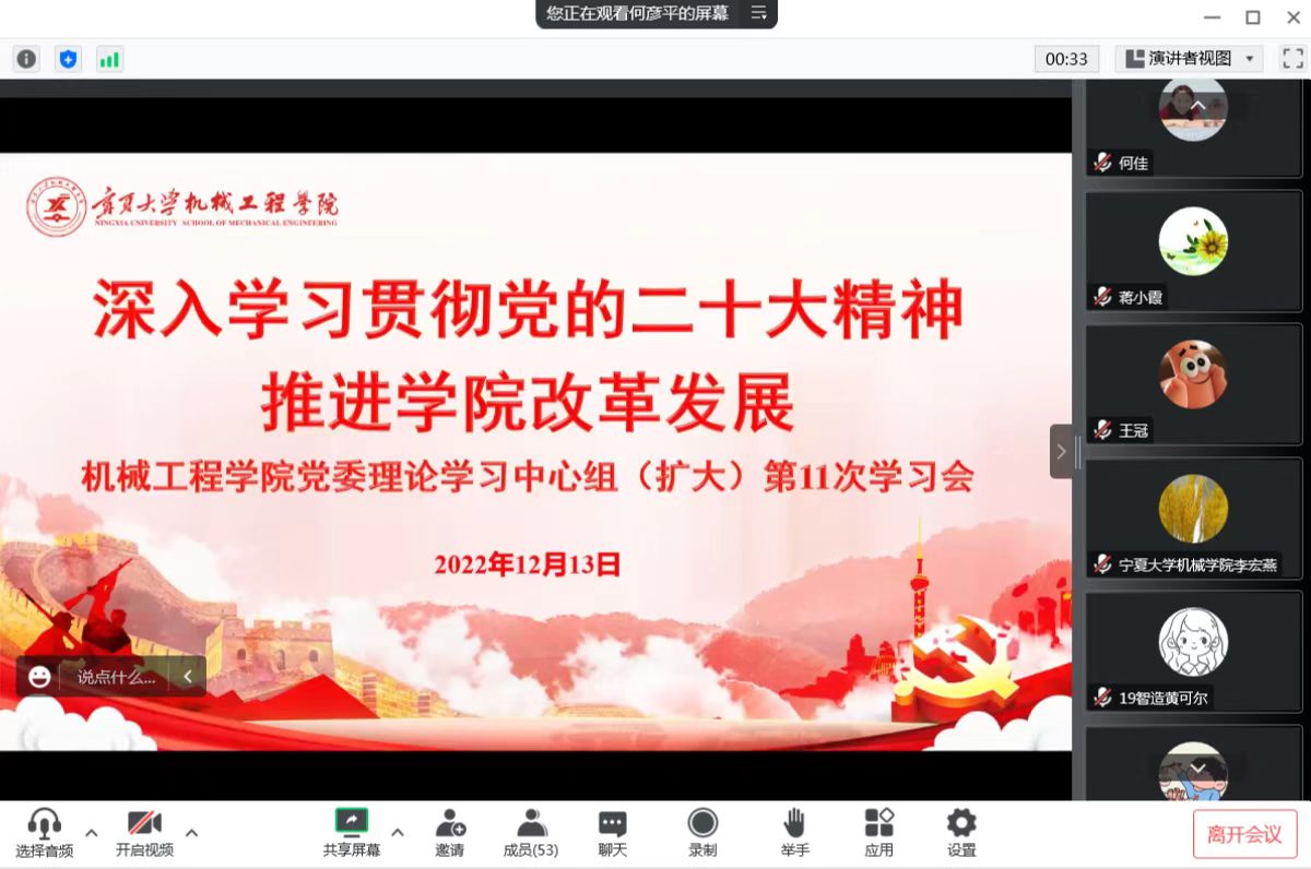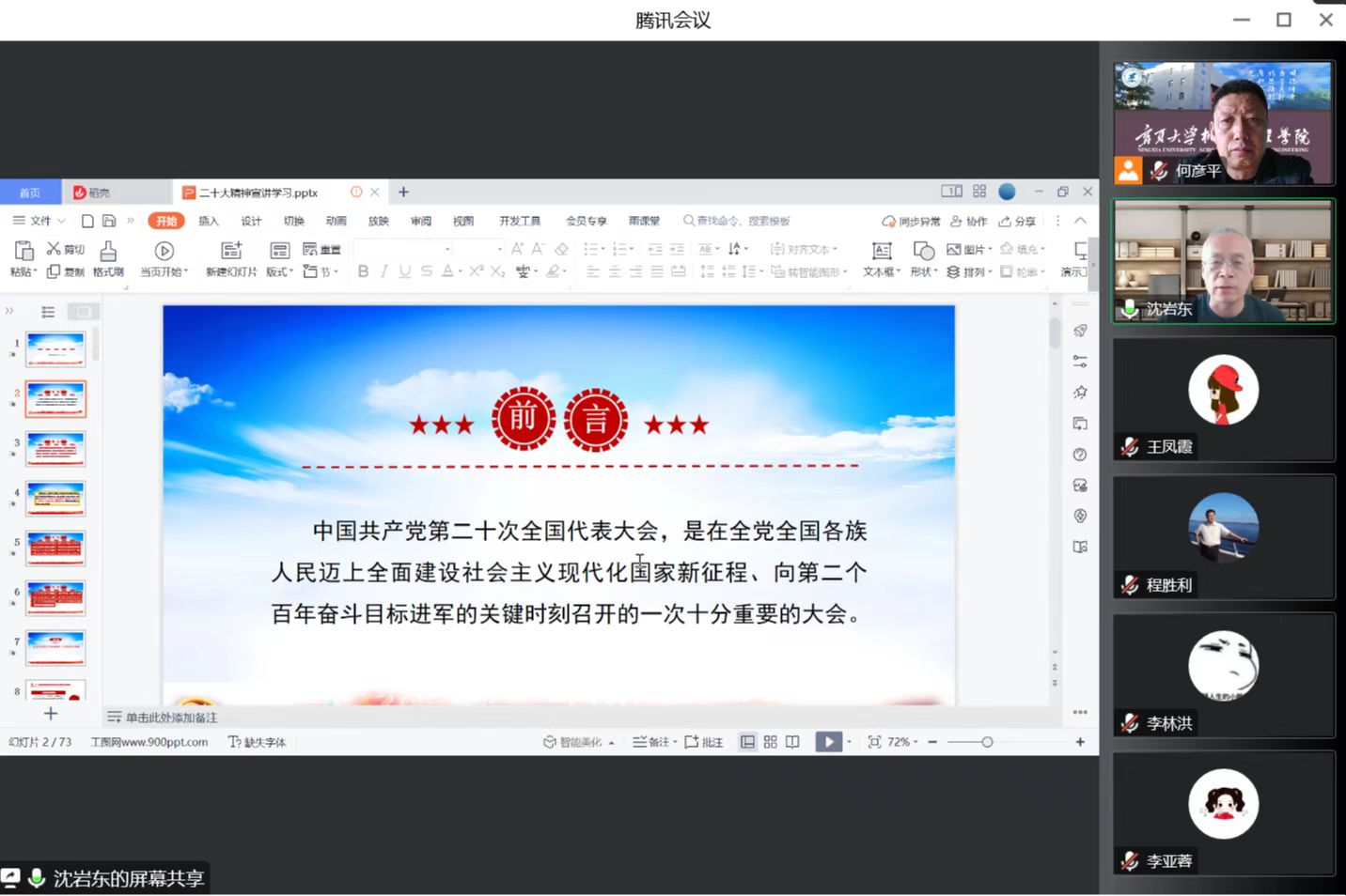 12月13日,新葡京官网线上组织召开2022年院党委理论学习中心组(扩大)第十一次学习会,邀请新葡的京集团35222vip党的二十大精神巡回宣讲团成员、马克思主义学院教师沈岩东作“党的二十大精神宣传学习”专题辅导报告,进一步深入学习贯彻党的二十大精神。院党委书记程胜利主持会议。