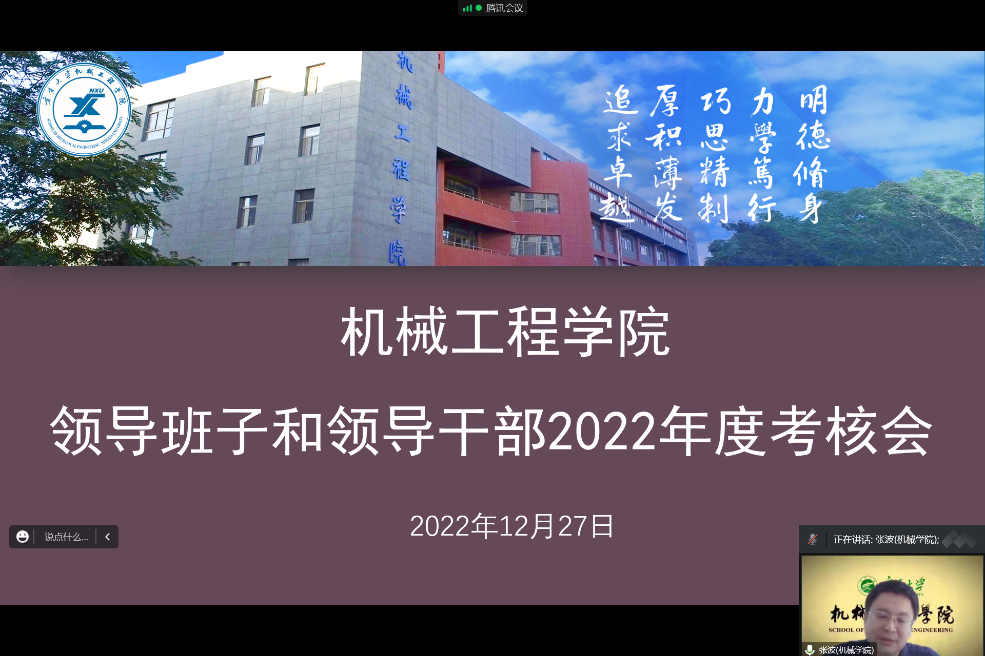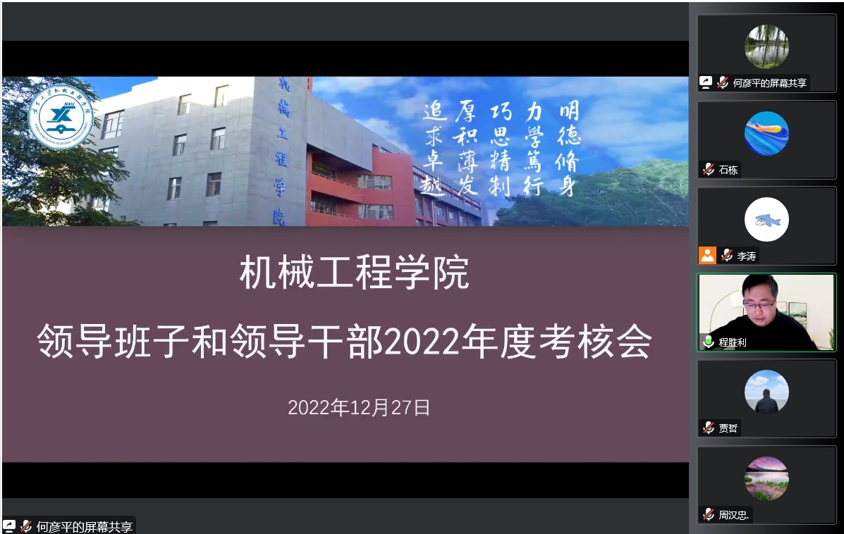 学院党委书记程胜利代表学院领导班子和个人进行述职汇报,汇报从思想引领、党建工作、“课程思政”团队培育、党风廉政建设、疫情防控、学科建设、人才培养、服务社会、对外交流等方面梳理了一年来的重点工作,分析了工作中存在的问题并谋划了下一步举措。程胜利指出,新葡的京集团35222vip师生员工在校党委、行政的坚强领导下,学院党政班子团结带领全院师生员工,以习近平新时代中国特色社会主义思想为指导,深入学习宣传贯彻党的十九届历次全会、党的二十大、习近平总书记视察宁夏重要讲话指示批示、自治区第十三次党代会和学校第七次党代会精神,紧紧围绕学校“双一流”和学院“十四五”目标任务,精诚团结,以钉钉子精神推动学院各项事业取得新进展。一年来,学院以创新人才培养模式、深化实施服务社会战略、国际化战略、人才强院战略、一体发展战略,完成预期各项目标,为今后事业发展奠定了坚实的基础。下一步学院将坚持党建与业务工作同频共振,持续深入学习宣传贯彻习近平新时代中国特色社会主义思想和党的二十大精神,紧紧围绕“立德树人”中心任务,以一流学科建设为基础,以一流人才培养为核心,以创新重大成果为标志,进一步凝聚学科方向,充分发挥各学科综合优势,全力做好机械工程专业认证专家进校考察工作,落实院长马玉山院士有关“卓越工程师”培养优化意见,完善学院人事人才工作体制机制,推进学院事业全面发展。