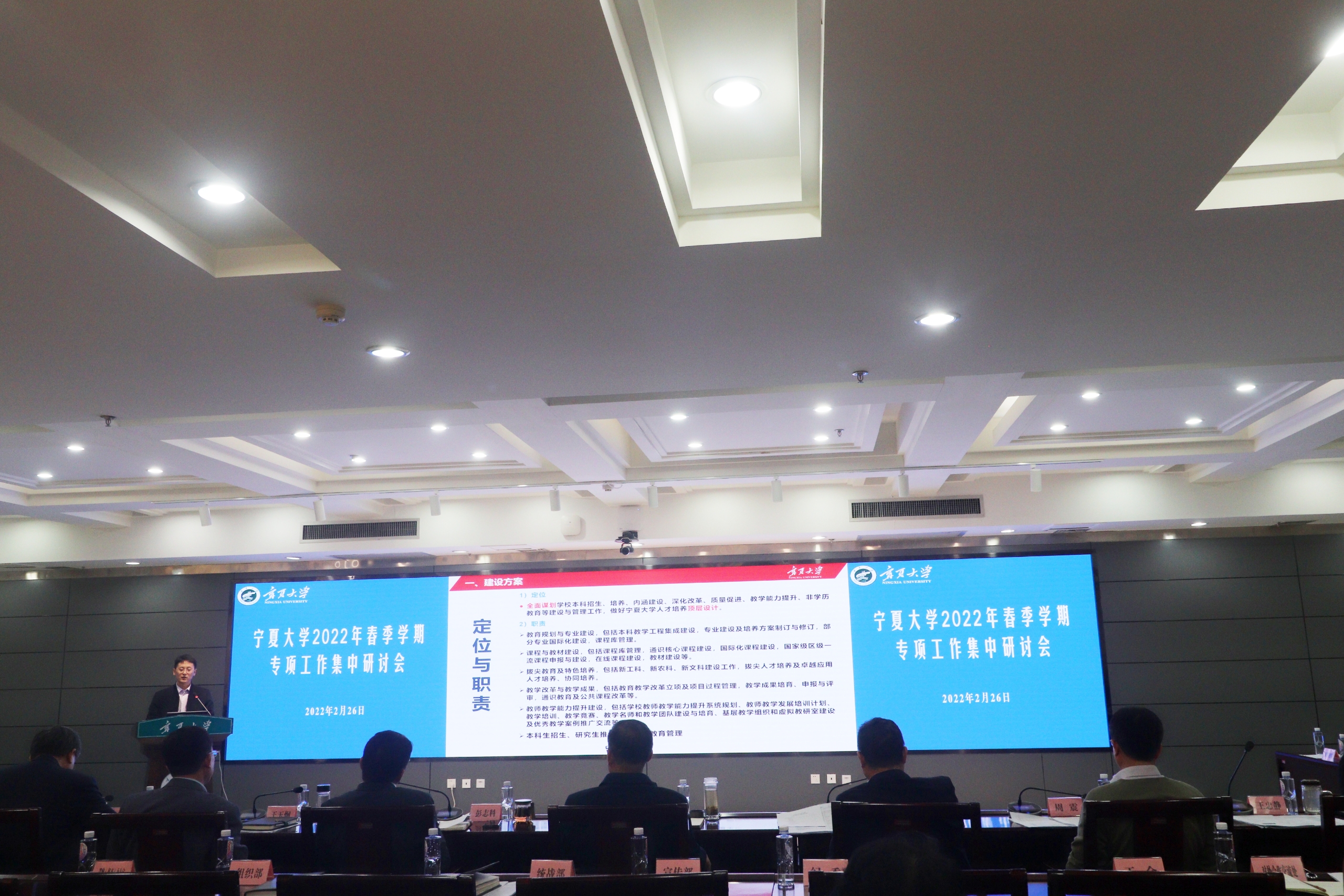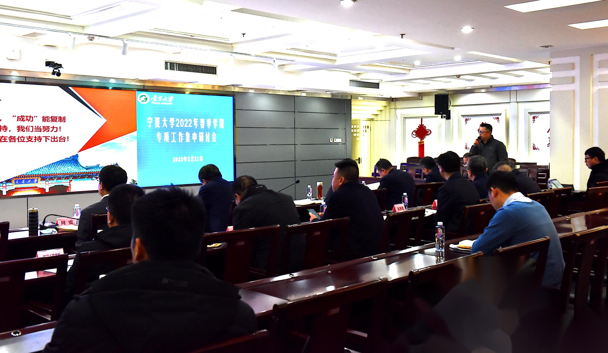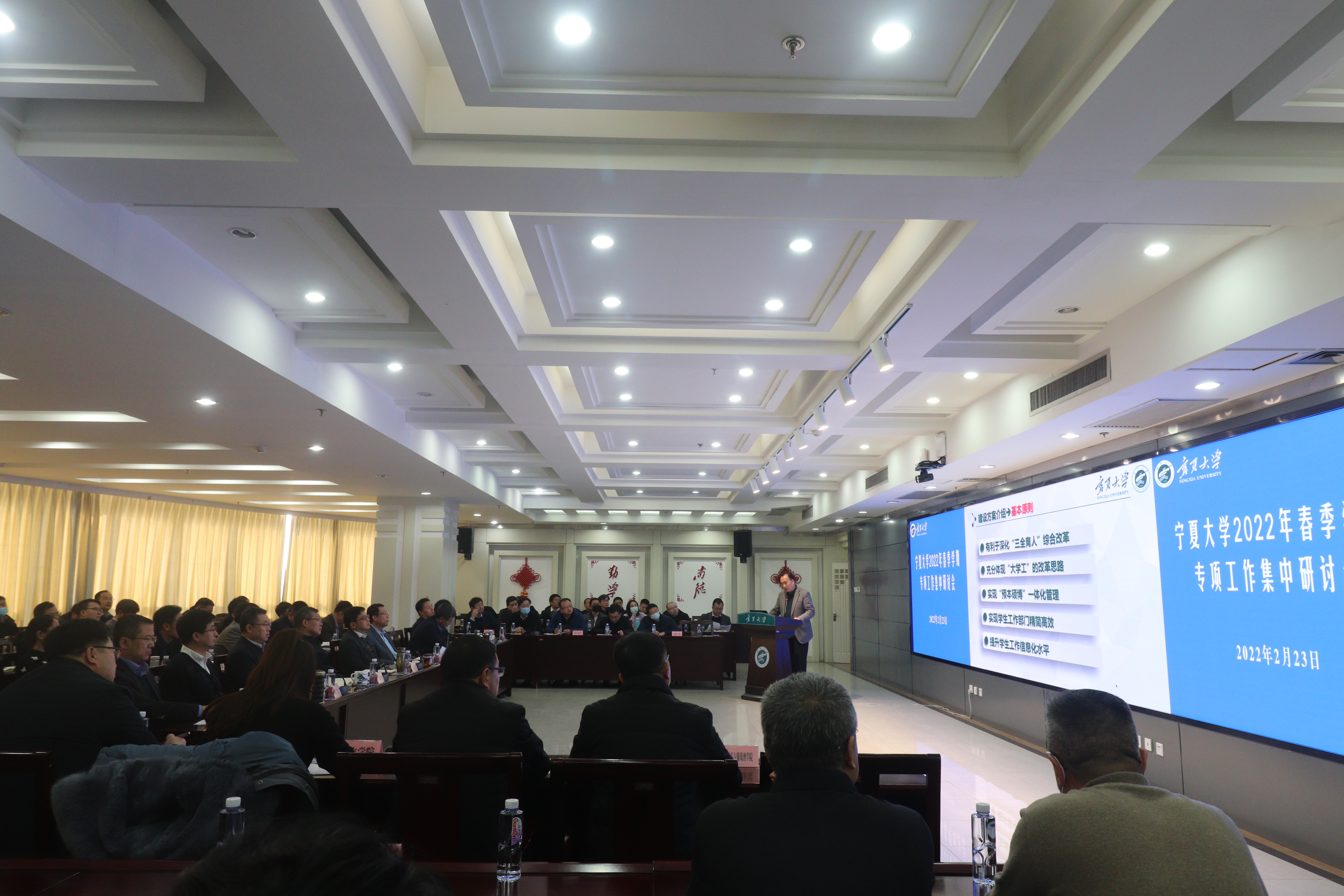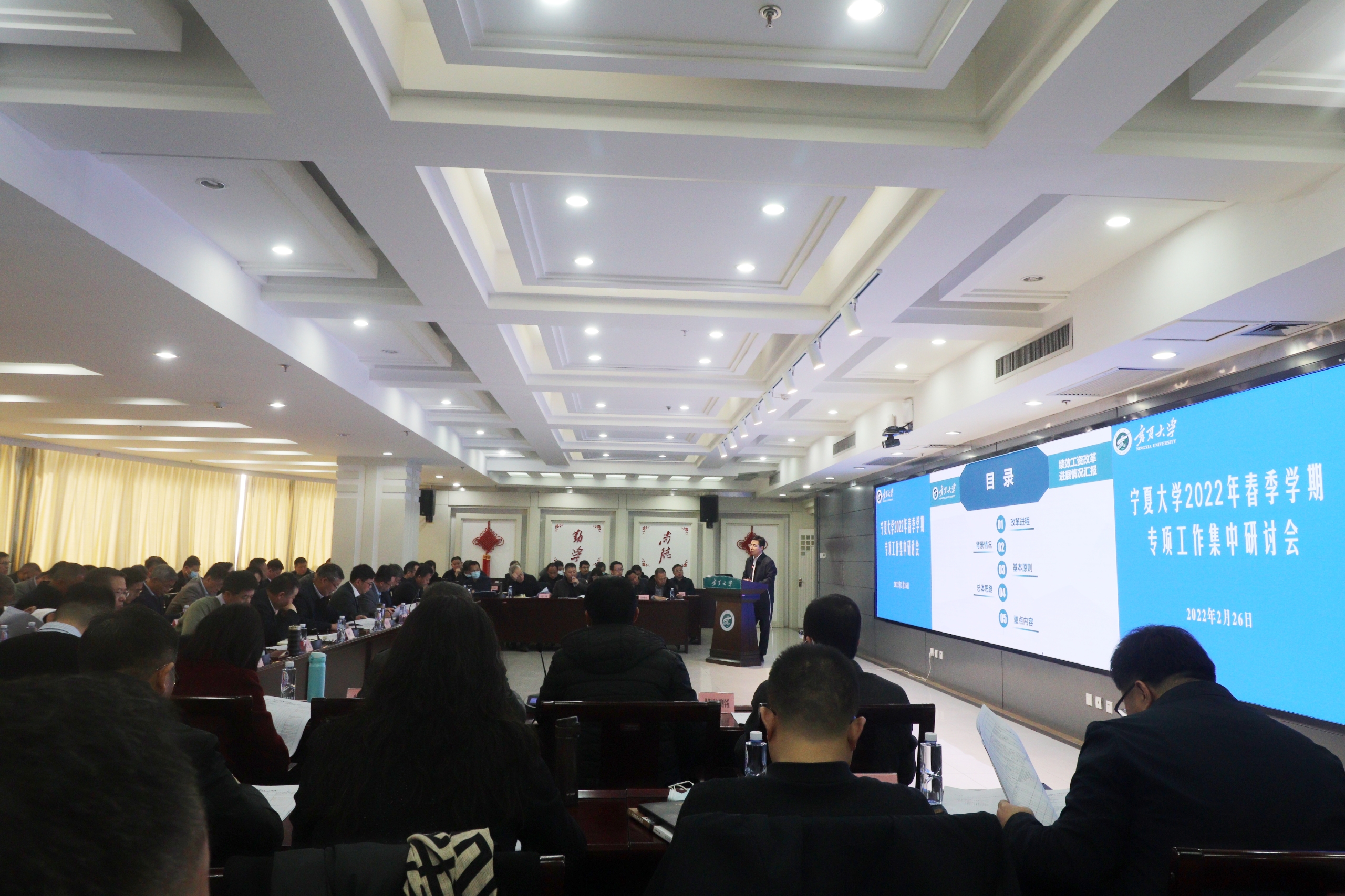 2月27日下午,新葡京官网在贺兰山校区文荟楼东报告厅召开2022年春季学期重点工作部署会。领导班子成员从学校实际出发,结合各自分管领域,紧扣高质量发展主题,聚焦学校2022年建设发展主要任务,安排部署分管领域新学期重点工作。