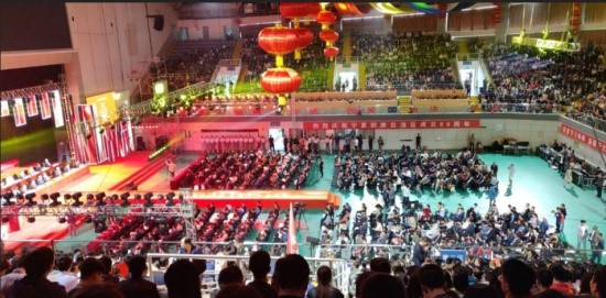 八点半时大学生活动中心召开校庆庆典祝贺宁大、展望宁大。会场上,校友齐聚一堂,热泪盈眶,共述旧情,回忆过往校园生活,场面十分温馨。随后安排了校庆专场文艺演出,一段宁夏说唱,一场军训故事,一段六盘山上的我们,再绘宁夏百草黄云、百卉千葩;一袭追梦青春,再绘匆匆岁月、奋斗不息,歌谣悠扬,缭绕不绝。校园之歌,勤学之歌,求是之歌,歌歌入耳。老中青三代共同合作,亲如一家,展现宁大人风采。检校园花为日课,裒寻诗昔计年劳。60周年见证了宁大的翻然改进,日新月异,一歌一舞,舞出了新宁大。会场上表演令人心潮澎湃,观众积极响应,彩旗飘扬,舞美绚丽,掌声不断。