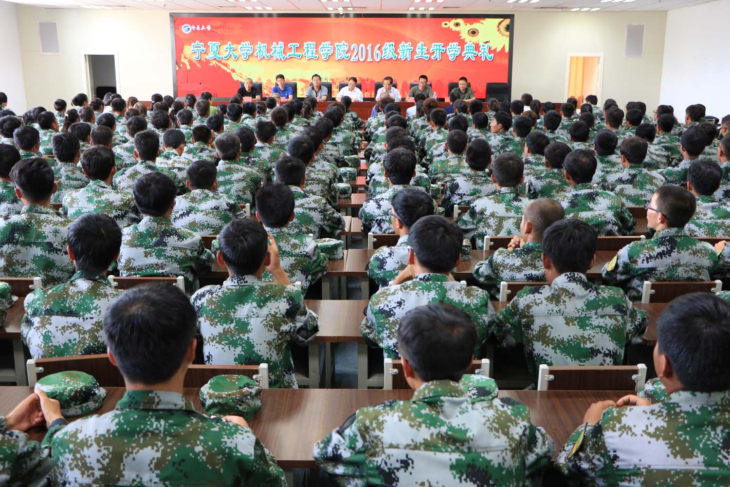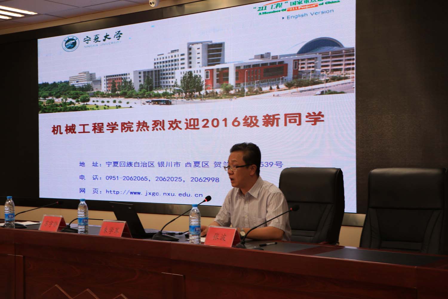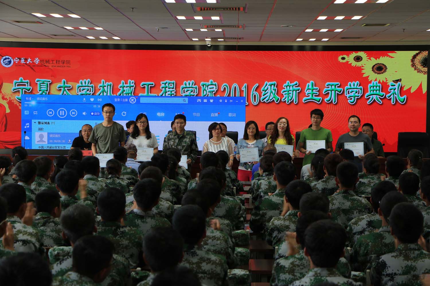 庄重的国歌声缓缓拉开了本次典礼的序幕。钟子杰书记宣读了新生班主任名单,在阵阵掌声中,钟书记向新生班主任颁发了承载着荣誉与责任的聘书。学院近几年新生班主任工作坚持选聘青年博士,坚持早晚自习制度,效果显著,学风建设有了长足进步。院长朱学军发表致辞。他首先代表学院向2016级新生表示热烈的欢迎和亲切的问候。随后,朱院长从欧洲出发,到亚洲,再到中国,他简明地介绍了世界一流大学的校史、校训及使其屹立世界之林的精神之髓。通过对新葡的京集团35222vip发展历程的回顾,着重强调了“尚德、勤学、求是、创新”的校训和“负重拼搏、开拓创新”的宁大精神。结合学院的办学历史和发展现状,进一步解读了“力学笃行、巧思精制、厚积薄发、追求卓越”的育人理念。并向新生学子阐述了学院毕业生的就业发展方向,提及了未来学院转型发展的机遇和挑战。朱院长希望新同学从军训开始,谨记校训,认真践行宁夏精神,合理规划大学时光,积极养成自我约束、主动学习、奋发向上的优良品质。