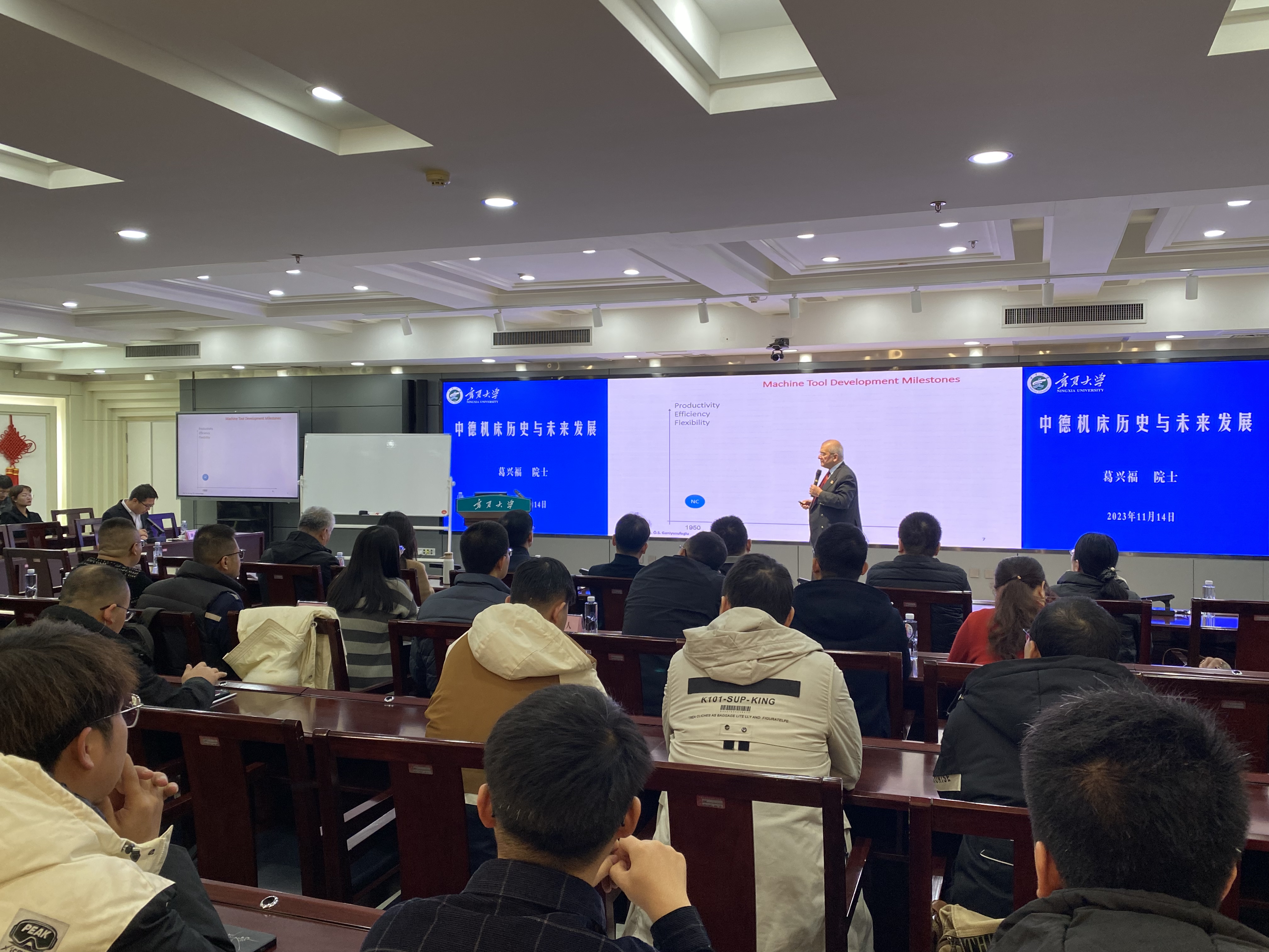 11月14日上午,葛兴福院士在新葡的京集团35222vip举办了《中德机床历史与未来发展》报告会,会议由前沿科学与技术学部常务副部长、新葡的京集团35222vip执行院长张波教授双语主持,葛院士从机床发展趋势、数控系统发展、基于大数据机床发展的未来商业模式、未来机械模型等四个方面,对机床行业发展历史、发展模式、销售模式、质量提升、数据化生产等方面进行了解读,区内10余家机械制造业企业和新葡的京集团35222vip师生共100余人参加。
