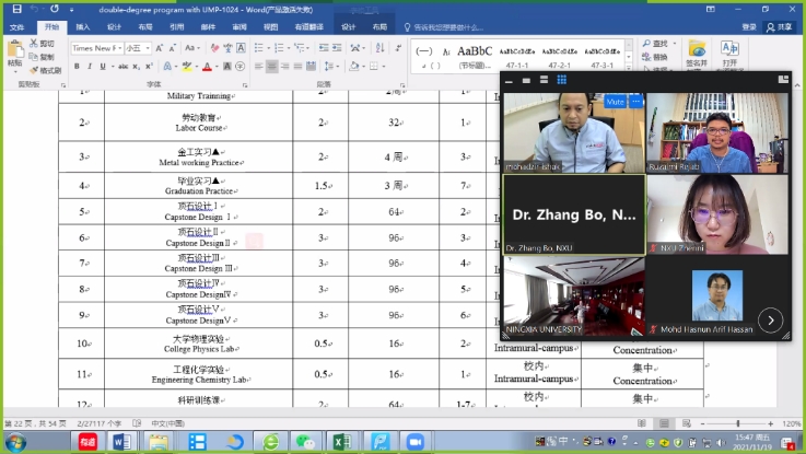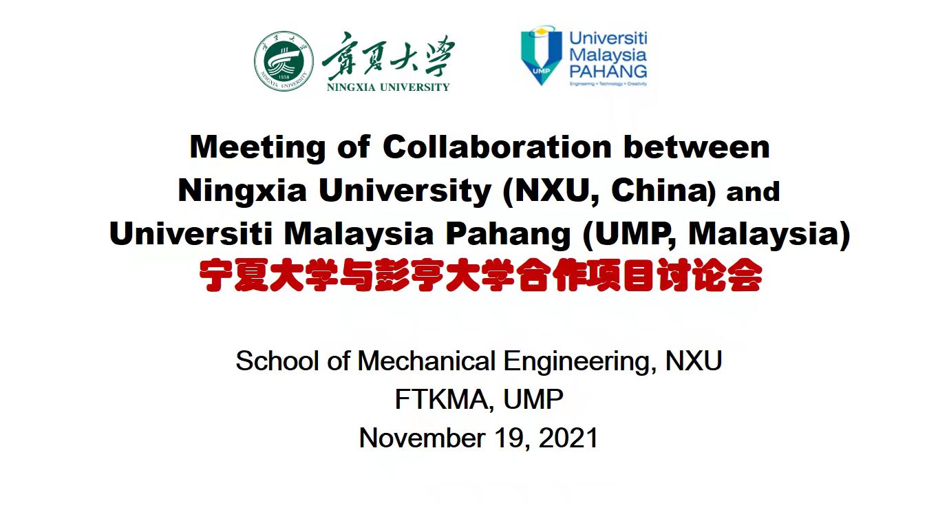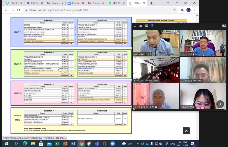 2021年11月19日,新葡的京集团35222vip(School of Mechanical Engineering,NXU)与马来西亚彭亨大学机械与汽车工程技术学院(Faculty of Mechanical & Automotive Engineering Technology, FTKMA , UMP),围绕中外合作办学项目和本科双学位项目,召开了在线视频工作会议(Zoom)。